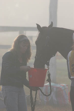 | IMBIL - Friday May 4 It was oh-so-nice and chilly overnight, and foggy in the morning, though once the fog burned off, it started warming up very rapidly. Peter had left Imbil for home at 4 AM because he had, as usual, dozens of things going on he needed to take care of. Before the heat got too out of control, Penny and Brooke went for a ride on Don and Bronco, and Melissa and Alexandra went for a ride on Kamahl and Jazzmin, while Jaimee cooked breakfast sandwiches, ham and eggs, for us. Alexandra is a year too young to ride in 160 km FEI rides yet, (14 is the limit) but she’s looking forward to her first one. After lunch we took the horses out for a walk, which turned into more of a grass-eating outing. This was the first real grass the horses had seen in who-knows-how-long, and we let them rip it up. We didn’t have much of a choice anyway because we couldn’t drag them away! It got so hot in the sun that we retreated to the shade of a big tree and let them eat under that for a while. We had to tug hard on them to get them to go back to their pens. Jaimee and Penny noticed later that Don was not happy because all the horses had to go through his pen to get to theirs; so Don was moved to a back pen where he wouldn’t be bothered all the time. Friday night after dinner, Penny pulled a chair up in front of Don’s pen. “Admiring your horse?” I asked. She said “I’m studying him. Wondering what he’s thinking.” I think she’s besotted. Not too many more people had pulled into the Fairgrounds yet. Everybody in the Toft corner crawled in bed by about 8:30, and all was quiet on the ridecamp front. Saturday May 5 (Kentucky Derby day, back home) In the morning after feeding everybody, Jaimee noticed that Don wouldn’t eat his food, because, back in his front big pen, his feed bucket was too close to the gate where people kept coming and going to get things. So she moved his bucket of food to the back of the pen, and there he stayed, happily eating now, further away from humans. Peter returned this morning, this time to stay through the ride, and, his phone didn’t even ring off the hook. Well it did ring, but not constantly. He even sat down a little while under the big tent we’d had put up at our spot, though he couldn’t sit still for too long. He had all 5 horses brought out to watch them trot out. From watching and studying them, and giving them all the once-over, he decided Penny would of course still ride Don, Brooke would ride Zalman, and Melissa would ride Kamahl. Then they saddled them up and took them for a ride; Peter said I could take Penny’s car and drive up the road a ways and take pix. Yikes! I did, driving very carefully, and sweated in the heat waiting for them. It really was very hot today… not Malaysia hot, but unseasonably hot for this time of year here. By now, at the Toft’s farm, horses are normally wearing two rugs during the day. Just the thought of a rug, any rug, even their light ones, made me wilt. Back at ride camp, friends of Melissa’s, Jackie and Geoff Richards from Cooroora Arabians, stopped by; I got another “Oh you’re the Raven lady!” It seems my stories are going around Australia’s version of ridecamp, and some Aussies are also contemplating possible Raven replacement solutions. : ) (Stay tuned for a comprehensive Raven update). I also met Sue Crockett the photographer whose good photos I’ve seen in a number of endurance magazines in Australia and New Zealand, and her husband Toby. Later the horses were saddled up again for a ride, and I got to go along with Melissa and Alexandra, on my buddy Bronco. We headed up the road and did a little 10 km training loop through the pine forest (no eucalyptus here), and already with that little bit, I would have been lost! There were big arrows marking the trails here, in different colors, but I just seemed to miss some of them! Good think I wouldn’t be whizzing along in the dark on this ride. We met quite a few riders coming and going, but there weren’t too many boisterous hellos. Maybe it was my reputation as a New Zealand Dreg, or maybe it was the company I was keeping, or maybe it was just that all the riders were concentrating hard on their challenges for tomorrow. Or, it was too hot and everybody was stunned from the heat. Or maybe it was that everybody else had been there before, and I was overly excited just to be lucky enough to be riding a horse with good company on a new part of the planet. Too bad the Raven wasn’t riding along, because he would have been having a great time too, and people probably would have recognized him! When we got back to camp, Penny and Brooke and Melissa got their tack ready, and the Toft crew set up buckets and things for the strapping. Vet-in was at 2:00 PM; and while those of us without horses were watching, Mark Tylie, the young man who won the New Zealand Nationals appeared, and said “I have a package for you.” He was kind enough to bring me my credit card that has been chasing me around the world for a while. I think the card has more air miles than I do now. Mark wasn’t riding; he was just here to watch the ride. Sample and Partners sponsored this first FEI *** 160 km ride in this part of Queensland. There was only this 160 km ride and no other distances; I’d talked to some people who weren’t coming because they weren’t ready for a 160 km this early in the season. So the Imbil ride probably missed out on a bigger number of riders, though putting on an FEI the first time was probably a big enough task that they didn’t want any other distances to deal with. At the 5 PM ride meeting, Bob Sample talked about the ride, and gave out the official ride time, which we all set our watches to. He said temperatures were 6-7* above average yesterday, so that was going to make it harder on the horses. FEI requires 6 loops, so they would be: loop 1 - 37 km, loop 2 - 30 km, loop 3 - 26 km, loop 4 - 31 km, loop 5 - 21 km, loop 6 - 15 km.