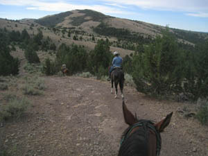 | Wednesday August 13 2008 I love riding in our Owyhee back yard, which stretches all the way to Nevada and, heck, probably to Mexico and Canada if you know where all the fence gates are, but it's great to cover new trails too. This was still in our back yard - just 18 miles down the road by diesel truck and trailer, (10.57 miles as the Raven flies) to the top of Bachman Grade. We could have ridden there, and Steph's rides have gone there before; but Rick's horse Surri is still young (four) and isn't in condition to do long or hard rides yet, and it's good experience getting the horse used to loading up to go ride, and riding over new territory - and we all wanted a change of scenery. We left in the morning so it would be cooler - and we'd be higher, 5900' instead of 3200', in a juniper forest in the lower hills of the Silver City range of the Owyhee Mountains. We followed an old road to the south, up and up with a view over the Jordan Valley and more layers of Owyhee Mountains to the west, and the Oreana valley to the east. Much of the ground was littered with small natural obsidian (no flakes, no worked pieces), and we threaded through some big rocky outcroppings. Jose loved the very tasty lupines, and he really does like to stop and look at the scenery. (Or... is he looking over his shoulder for cougars?) The horses got some hill climbing in, and we all had a nice hour and a half ride - a picturesque alternative to the high desert. |